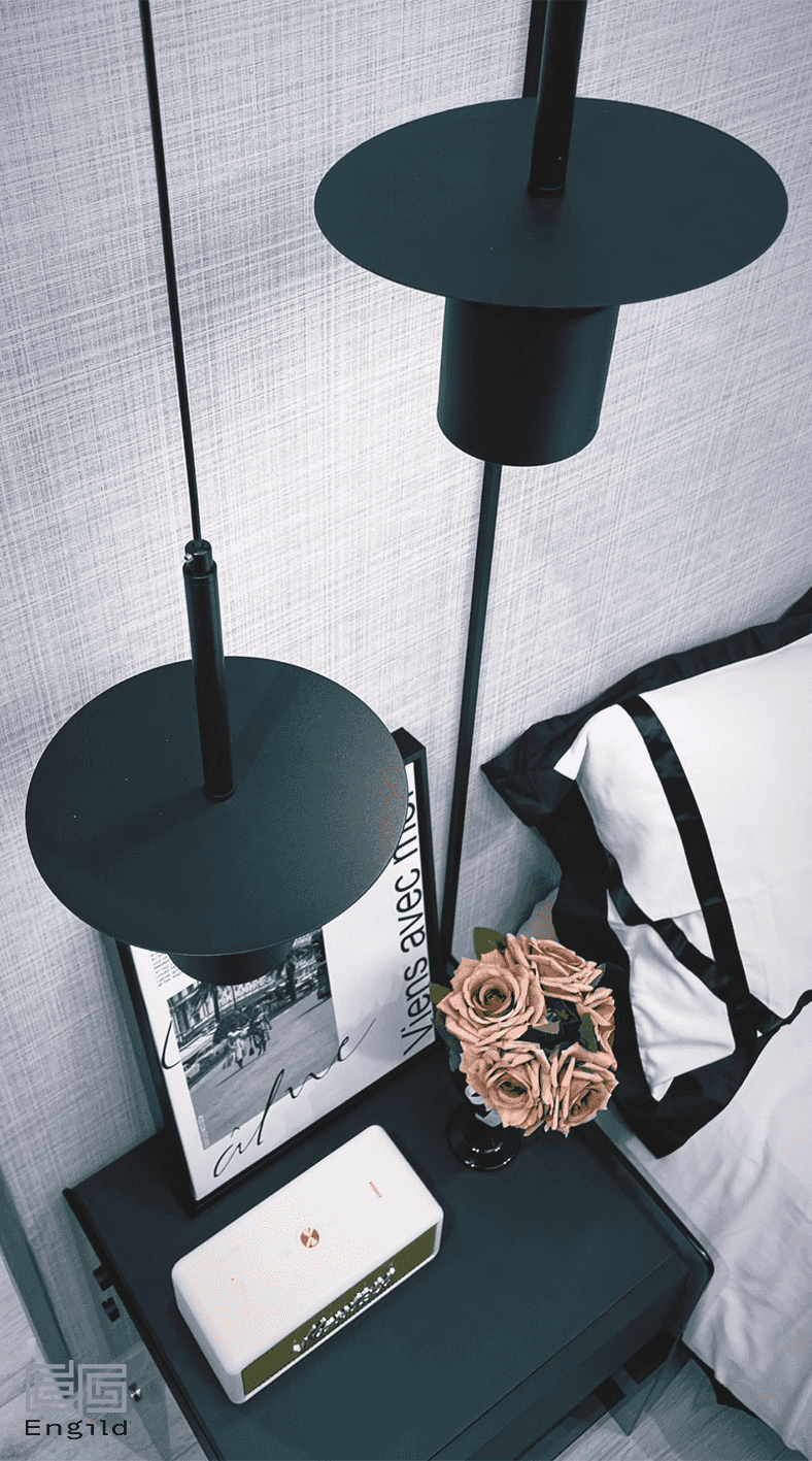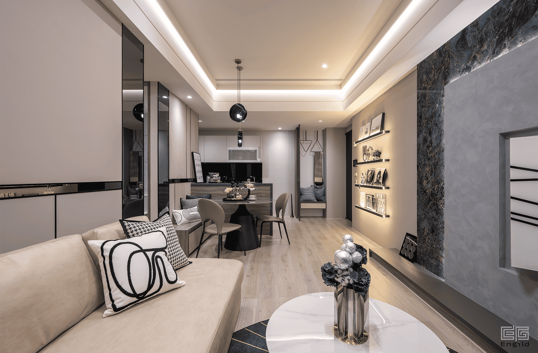 收納設計則以嵌入式手法呈現,維持視覺上的整潔,同時在衣櫃造型上運用幾何線條,創造出層次感,使空間更具識別度。