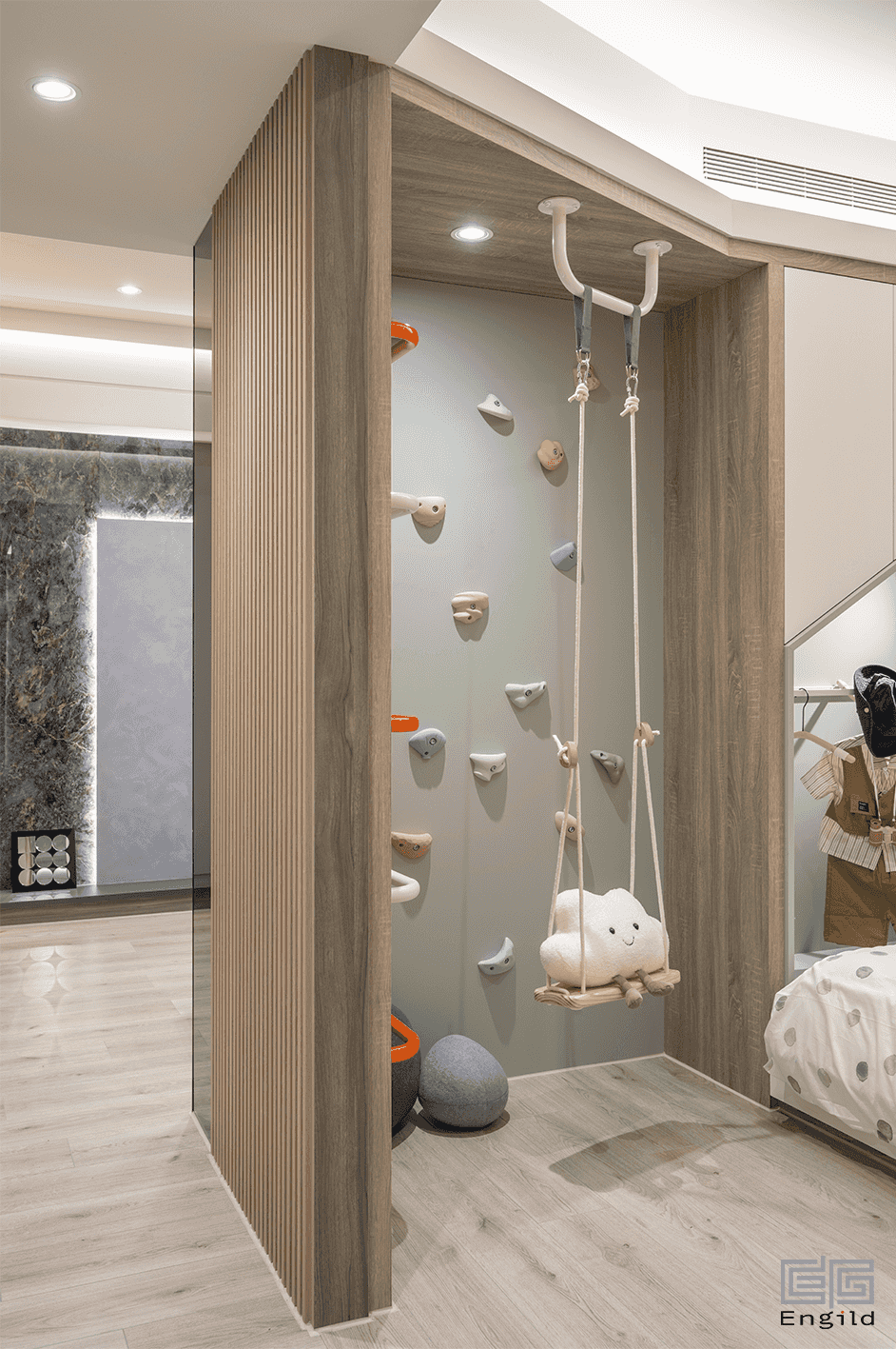 將遊戲與生活機能結合,透過攀岩牆、繩索鞦韆等元素,讓空間不僅僅只是靜態休憩的區域,而是具備互動性的活動場域。木質紋理與溫潤色調的搭配,使空間更具親和力,軟質材質與圓角設計則讓空間保持安全性與舒適感。